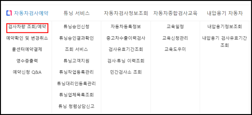 1. 사이버검사소 홈페이지에 접속하여 상단메뉴의 [자동차검사예약 > 검사차량조회/예약] 선택.