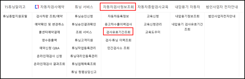 1. '한국교통안전공단 사이버검사소' 홈페이지 [자동차검사정보조회 > 검사유효기간조회] 선택
