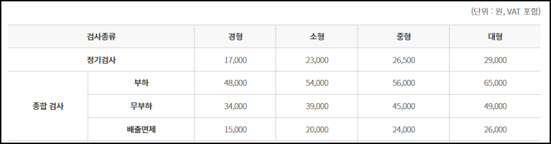 정기검사는 차종에 따라 경형 차량은 17,000원, 소형은 23,000원, 중형은 26,500원, 대형차량은 29,000원의 비용이 발생합니다. 종합검사는 부하, 무부하, 배출면제에 따라서 최소 15,000원부터 65,000원 사이대로 검사수수료가 발생합니다.