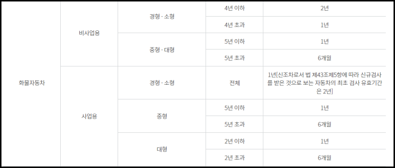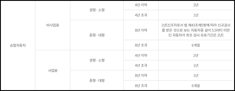 경형과 소형의 승합 및 화물차의 경우 비사업용은 차량 2년 초과 자동차는 1년에 한 번, 사업용은 차령 2년 초과된 이후 1년에 한 번씩 받아야 합니다.
