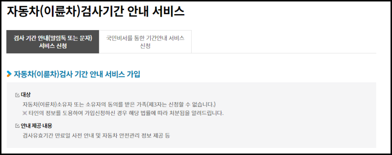 검사기간 알림 예약 서비스는 차량소유자나 소유자의 동의를 받은 가족이 신청이 가능하며, 알림톡과 우편발송을 안내를 해주고 있습니다.