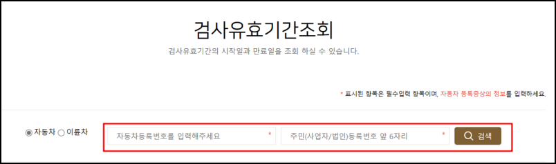 2. 검사유효기간 조회 창 '자동차등록번호, 소유자 주민번호 앞자리' 입력