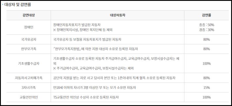 또한, 자동차검사 비용은 일부대상자에게 감면 혜택을 제공하고 있습니다. 장애인과 국가유공자, 한부모가족, 기초생활수급자, 자동차사고피해가족, 다자녀가정, 교통안전의인인 경우 최소 15%에서 100%의 수수료 감면혜택을 제공합니다.