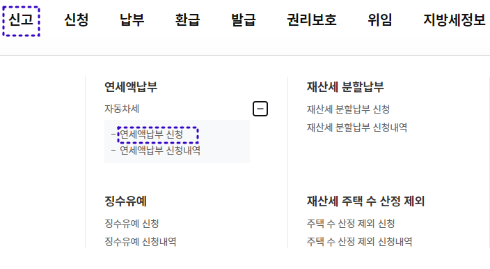 자동차세 연납신청 메뉴 선택: 메인 화면에서 '자동차세 연납신청' 메뉴를 찾습니다. 상단 메뉴 [신청 > 연세액 납부 > 자동차세 > 연세액 납부신청]을 선택합니다.