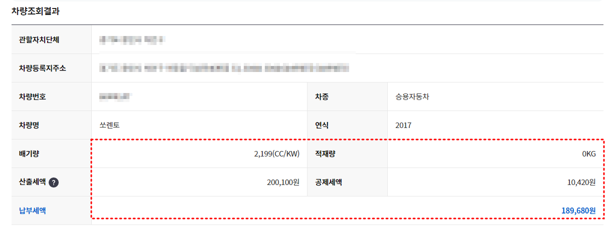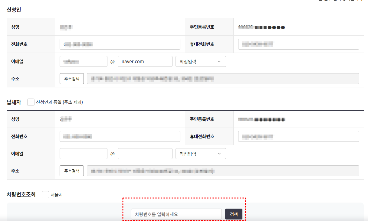 차량 정보 입력: 신청인과 납세자 정보가 맞는지 확인 한 뒤 하단의 차량번호조회에 번호를 입력한 뒤 검색을 합니다.  자동차 등록번호와 소유주 정보를 입력하여 차량을 조회합니다.