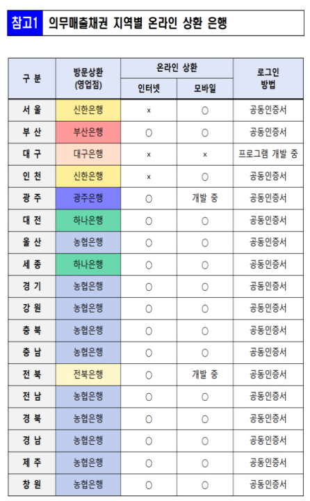 은행 홈페이지 및 앱을 통한 조회도 편리합니다. 지역별로 담당 은행이 다른데, 서울·인천은 신한은행, 대전·세종은 하나은행, 그 외 대부분 지역은 농협은행에서 자동차채권 환급금 조회 서비스를 제공합니다.