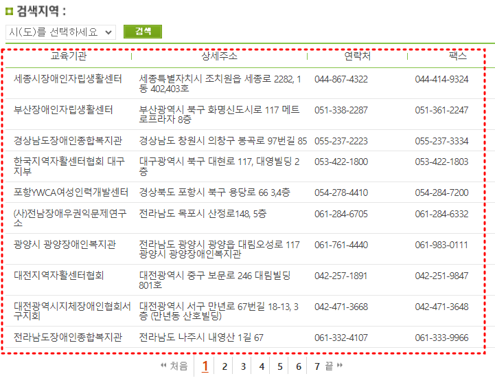 검색되는 장애인 활동지원사 교육기관 결과는 교육기관명과 상세주소, 연락처, 팩스 번호의 정보를 확인할 수 있습니다.
