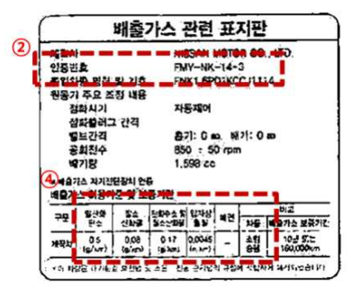 이외에도 저공해차량 확인방법은 차량 본네트 안쪽이나 엔진 후드위에 부착되어있는 배출가스표지판을 통해서도 확인할 수 있습니다.