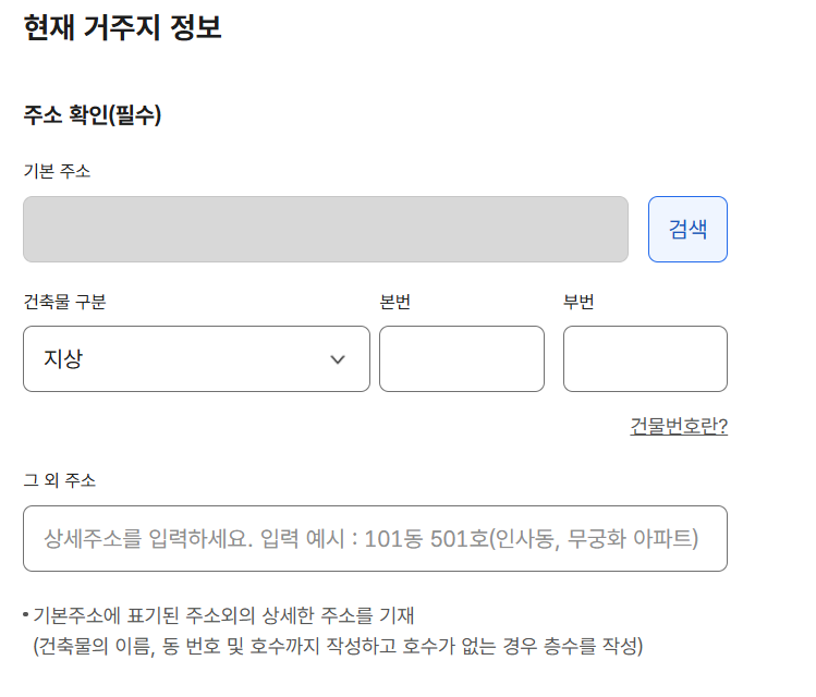 4단계는 현재 거주지 정보를 입력하는 창입니다. 해당 창은 이사를 한 주소를 입력하는 창으로 주소를 상세하게 입력한 뒤 '세대구성 방법'을 선택합니다.