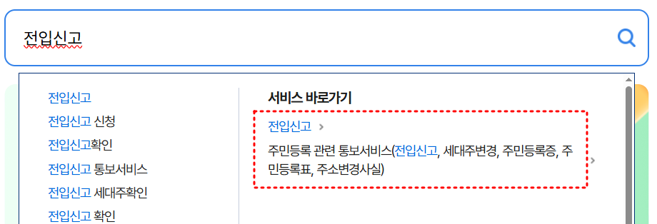 전입신고 인터넷 신고를 위해서 정부24 홈페이지에 접속하여, 검색창에 '전입신고'를 검색하여 진행해야합니다.