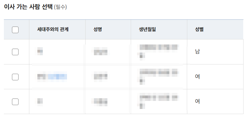 본인인증절차를 거치면, 이사가는 사람을 선택하는 창이 보입니다. 세대주와의 관계, 성명, 생년월일이 표시되며, 전입신고를 하는 대상자를 선택한 뒤 동의절차를 거치고 다음단계로 이동합니다.