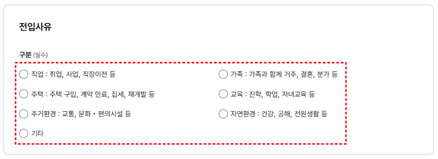 전입사유에는 직업, 주택, 가족, 주거환경, 자연환경, 기타 등으로 알맞는 항목을 선택해주세요.
