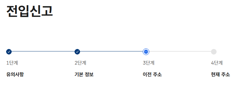 전입신고는 총 4가지 단계를 거치게됩니다. 1단계는 유의사항으로 전입신고 인터넷 신고시 주의사항이나 필요서류, 안내사항들을 안내하고 있으며, 동의절차를 거치면 2단계로 이동됩니다.