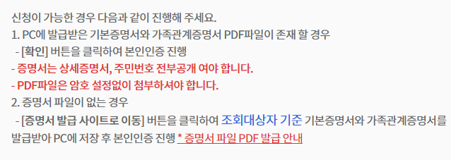 또한, 이러한 서류는 PDF 파일 형식으로 준비해야 하며, 본인 인증 절차를 위해 주민등록번호가 전부 공개된 서류여야 합니다. 특히, 온라인 신청의 경우 PC에 해당 서류를 저장해 두어야 하며, 암호 설정 없이 첨부해야 문제가 발생하지 않습니다.