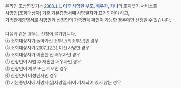 이때, 조상 땅 찾기 서비스를 이용하기 위해서는 조상님이 2008년 1월 1일 이후에 사망하신 경우에만 온라인 조회가 가능합니다.
