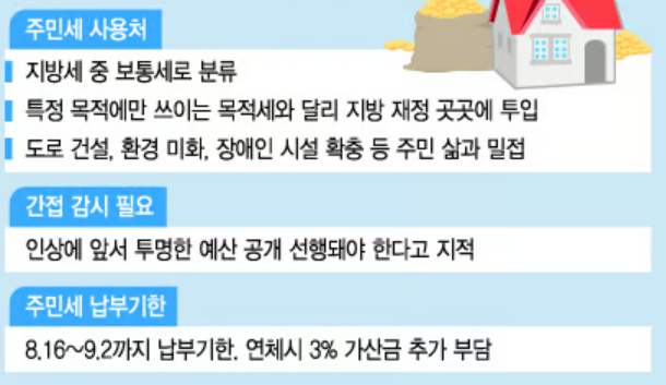 주민세는 국세와 달리 우리가 살고 있는 지역의 시·군·구 등 지방정부가 직접 걷어서 주민 생활에 필요한 곳에 사용하는 세금으로, 기한내에 성실히 납부하는 것은 우리 지역사회 발전에 직접적으로 기여하는 일이기도 합니다.