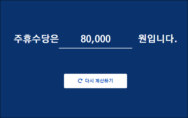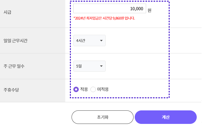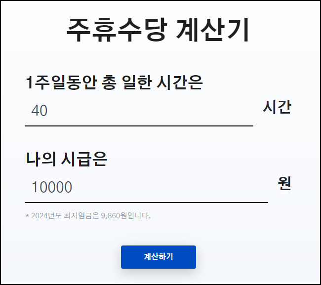 주 40시간 미만 근로자는 근무시간이 각기 다를 수 있으니, 일일 근무시간과 근무일수를 입력해서 계산하는 주휴수당 계산기를 이용하는 것이 보다 편리할 수 있습니다.