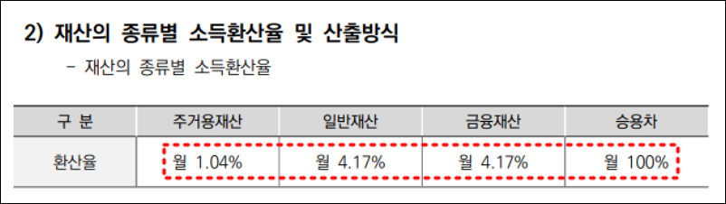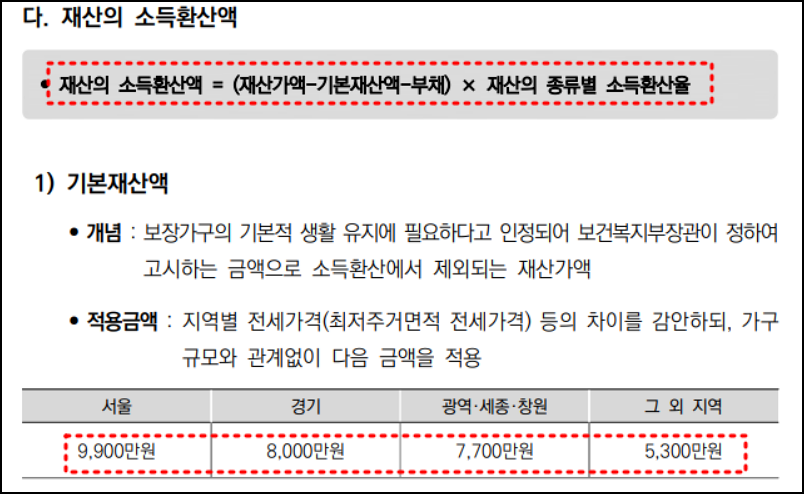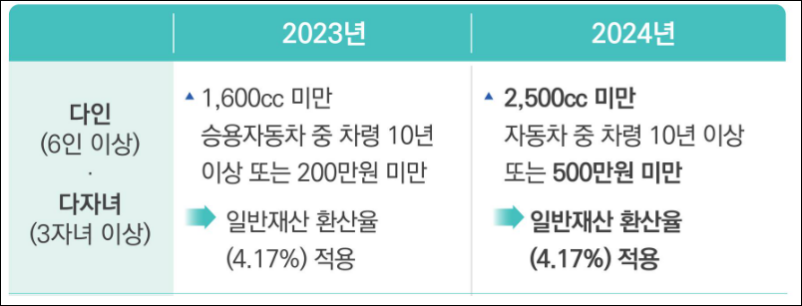 또한, 6명이상인 다인가구나 3인이상의 다자녀가구인 경우에는 자동차 재산 소득환산율 인하를 적용받아 2,500cc미만 자동차 중 차령 10년 이상 또는 500만원 미만인 차량의 재산 환산율을 그동안 100%였던 금액을 월 4.17%로 적용받을 수 있습니다.