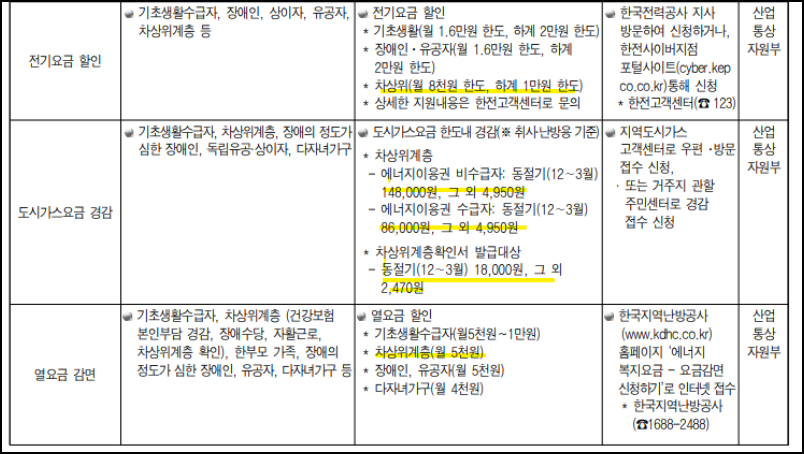 소득이 낮은 취약계층을 대상으로 기본료 1만1천원 감면과 통화료 35%감면혜택과, 월 8천원, 하계 1만원 한도로 전기요금할인, 동절기 148,000원한도내에서 도시가스요금 경감혜택도 받을 수 있습니다.