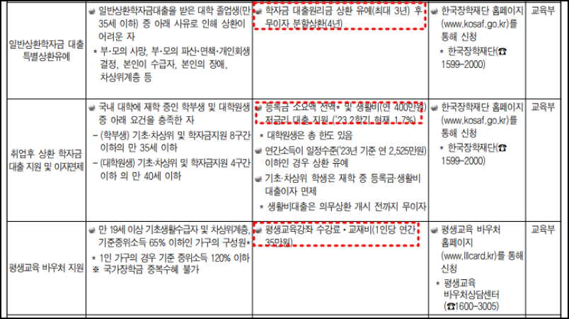 차상위계층 자녀인 경우 국가장학금 1유형의 등록금 전액 지원 혜택과, 다자녀 장학금 지원혜택, 시간당 12,220원 단가로 대학생 근로장학금을 받을 수 있습니다. 또한, 평생교육강좌 수강료 및 교재비를 연간 35만원 지원받는 평생교육 바우처 지원도 받을 수 있습니다.