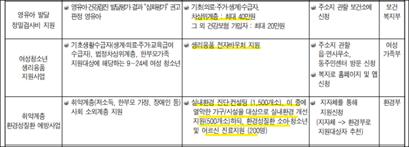 또한, 저소득층 기저귀와 조제분유를 월 8만원과 10만원씩 바우처 포인트로 지원받을 수 있습니다.