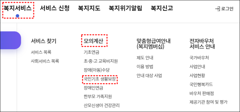 복지로 홈페이지 접속 후 '복지서비스 > 모의계산> 국민기초생활보장' 탭 선택