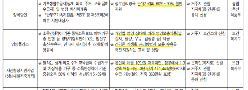 일하는 청년의 경우 본인이 매월 10만원 저축시 정부에서 매칭지원하여 만기시 1,440만원을 수령할 수 있는 청년내일저축계좌 혜택을 받을 수 있으며, 정부관리양곡을 60%~90%할인된 가격으로 지원받을 수 있습니다.
