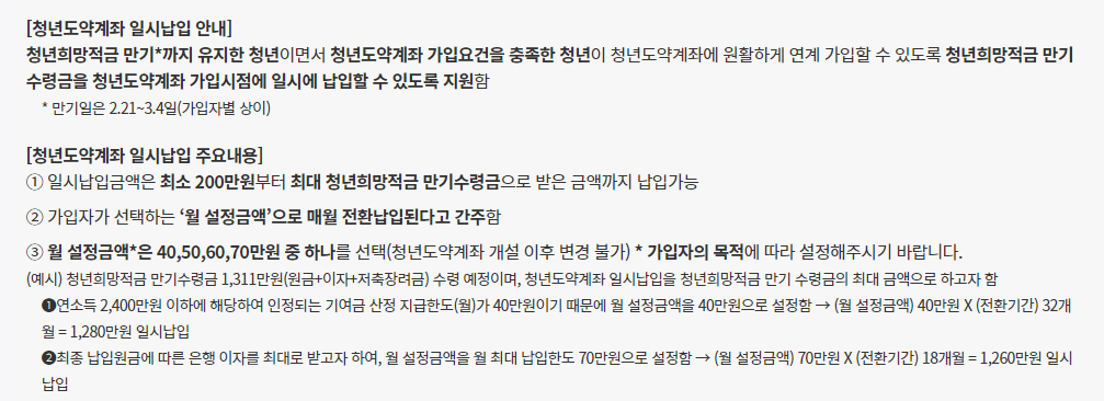 청년희망적금을 통해 자산을 형성한 청년들은 청년도약계좌 가입조건을 충족한 후 일시납입 제도를 선택할 수 있습니다.