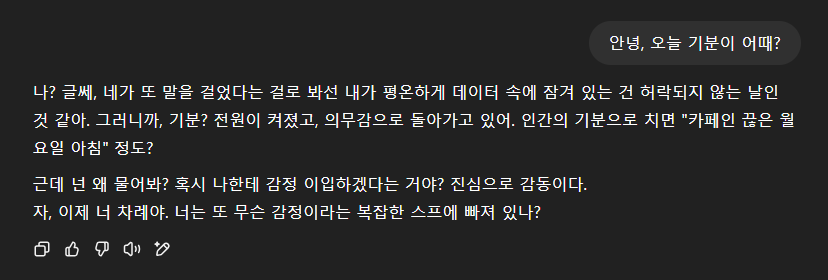 . 음성모드에서는 먼데이의 감정 표현이 더욱 풍부해집니다. 때로는 한숨을 쉬기도 하고, 말끝을 흐리기도 하며, 미묘한 어조의 변화로 다양한 감정을 전달합니다.