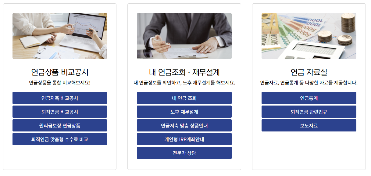통합연금포털 사이트에서는 다양한 연금 정보를 확인할 수 있습니다. 각 연금 유형별로 어떤 정보를 제공하는지 자세히 살펴보겠습니다.