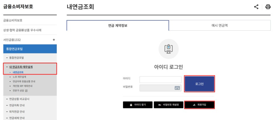 먼저 금융감독원 홈페이지 접속한 후, '금융서비스' 메뉴에서 '통합연금포털'을 선택하거나, 직접 통합연금포털 사이트에 접속합니다.