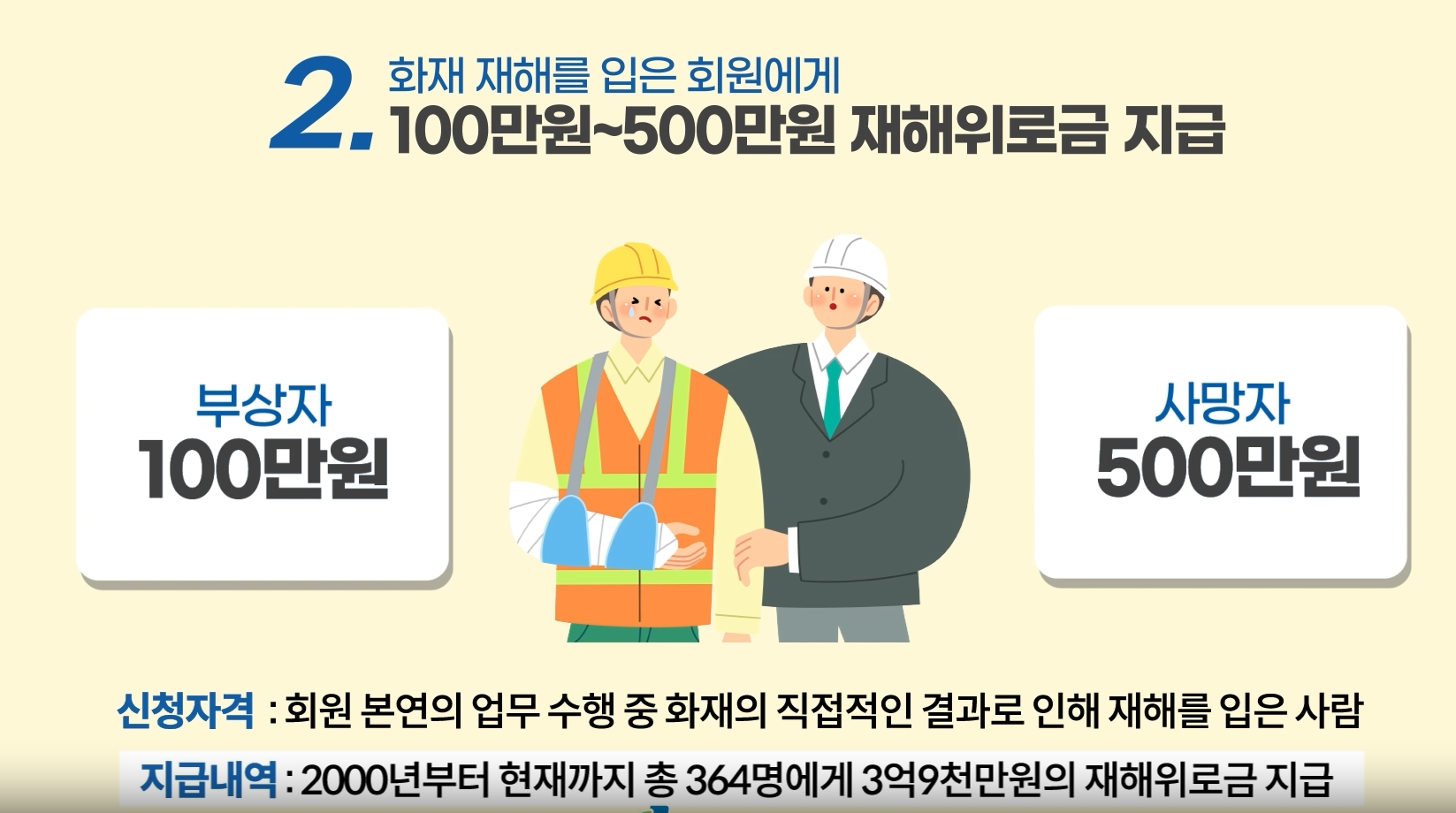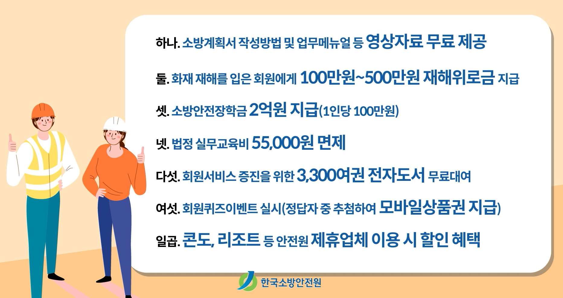 가장 큰 혜택 중 하나는 법정실무교육 수수료 면제로, 소방안전관리자 등 법정교육을 무료로 이수할 수 있고, 필요한 교재도 함께 제공됩니다. 이 외에도, 소방 관련 학문을 지원하는 소방안전장학금을 선발 지급하고, 재해위로금을 지급하는 등 회원들의 경제적 부담을 줄여주는 다양한 제도를 운영하고 있습니다.