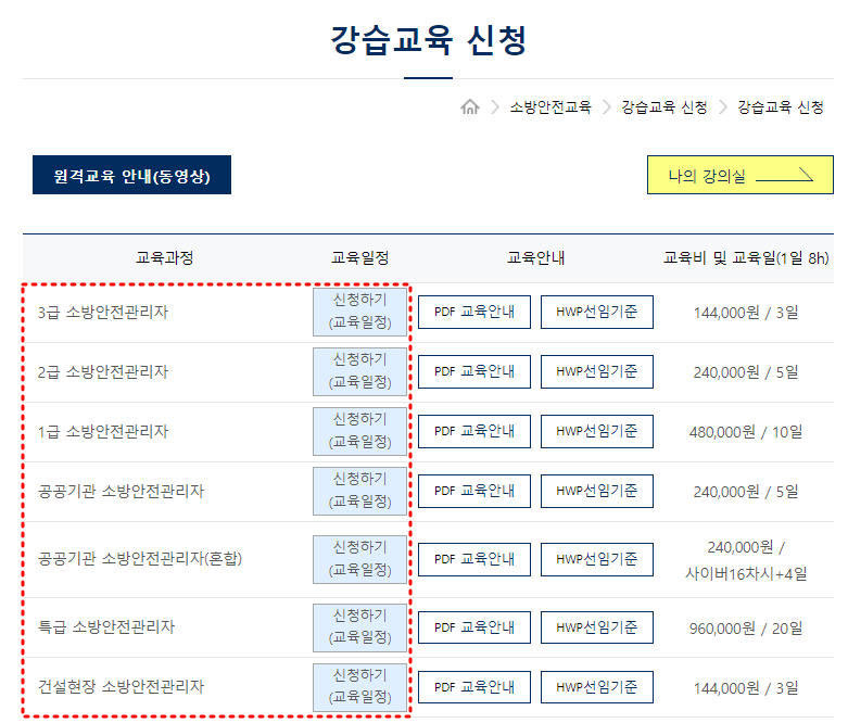 다양한 소방안전교육 과정이 준비되어 있으며, 각 과정의 세부사항을 확인한 후 신청을 완료하면 됩니다.