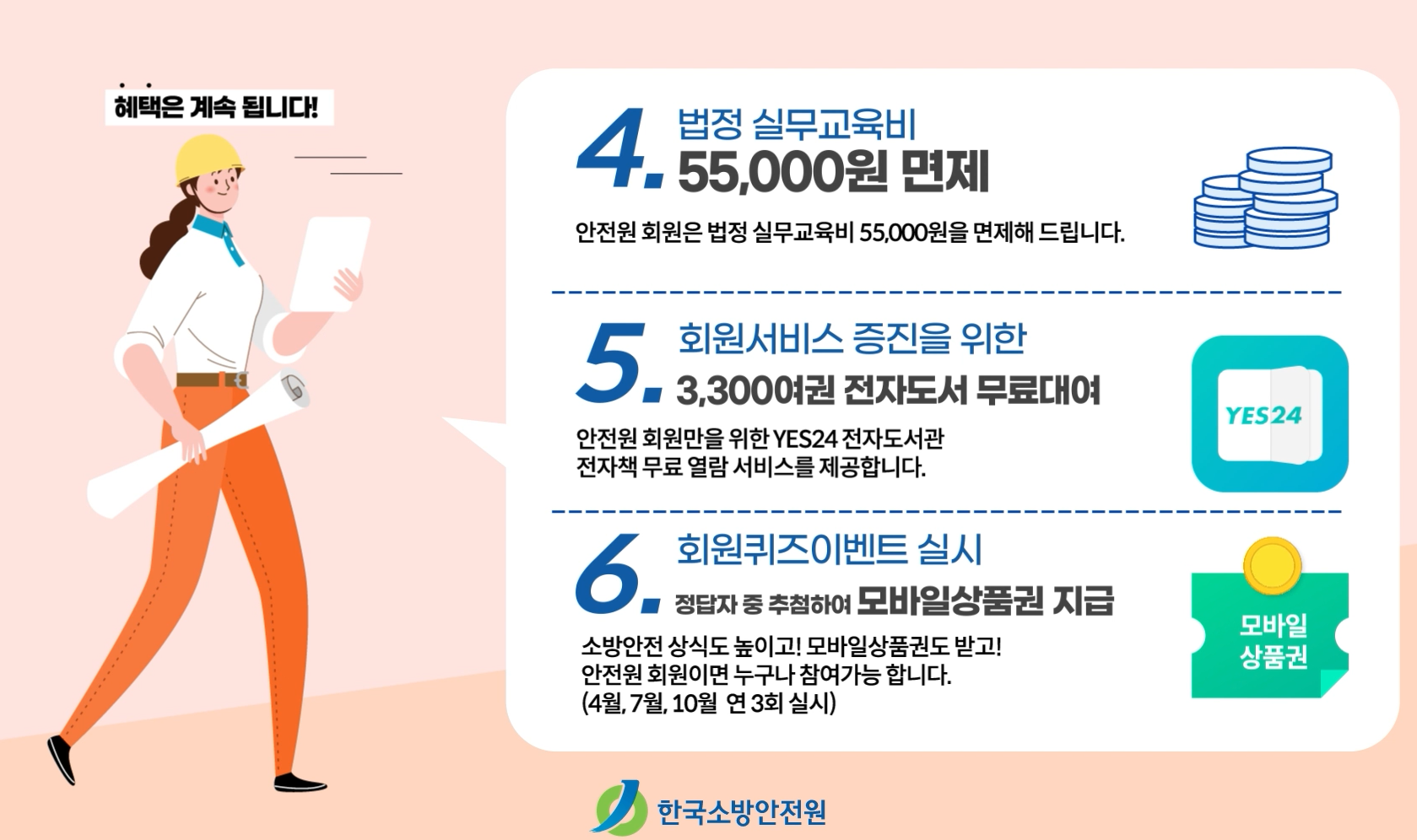 한국소방안전원 회원들에게 제공되는 혜택은 다양하게 구성되어 있으며, 소방안전 교육과 관련된 지원부터 실무에 필요한 정보까지 폭넓게 제공됩니다.