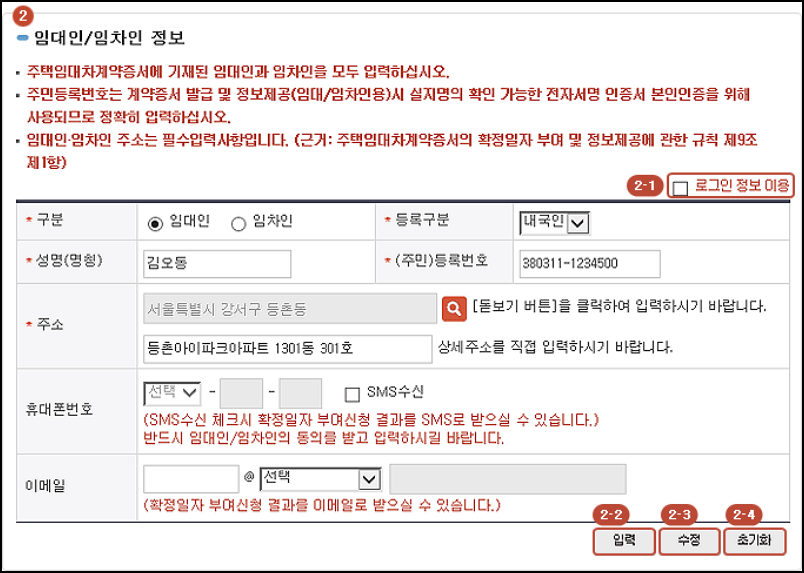 임대차계약서 하단에 표시되어있는 임대인정보와 임차인의 성명, 주민번호, 주소, 휴대폰번호 등을 입력합니다.