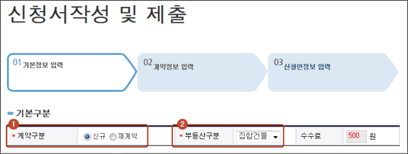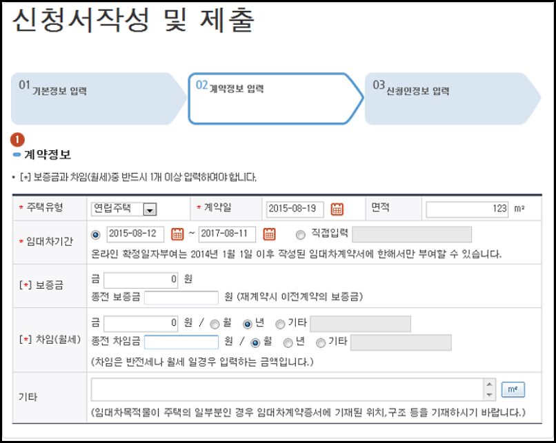 임대차 계약서에 기재되어있는 내용을 기준으로 주택유형과 계약일, 면적, 임대차기간, 보증금, 월세 내용을 정확하게 입력합니다.