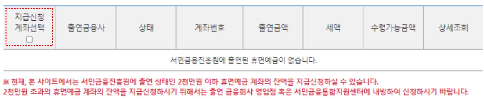 이때, 지급신청계좌의 체크박스를 선택하면 미수령금 지급신청을 할 수 있습니다.