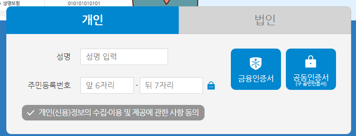 메인화면에 조회하고자 하는 대상자의 이름과 주민번호를 입력한 뒤, 그에 알맞은 공인인증서 또는 금융인증서를 이용하여 인증해 줍니다.