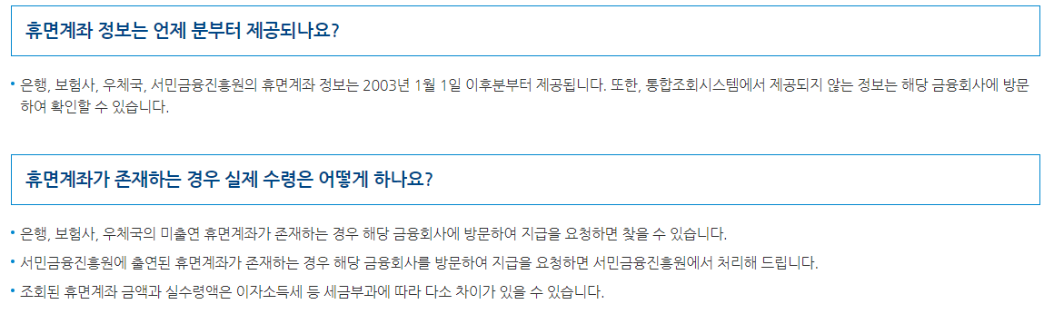 1. 통합조회시스템에서 확인가능한 계좌 정보는 2003년 1월 1일 이후 발행한 경우에만 조회 가능합니다.