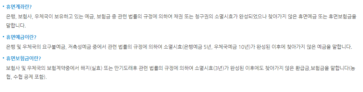 매년 12월 31일 기준으로 정산되어 금융감독원에 이관되며, 이자와 원금을 포함하여 최대 10년동안 보관되는데요, 만일 해당기간동안 찾아가지 않는 경우 국고로 귀속되어 사라지는 돈이니 그전에 꼭 확인해야 합니다.