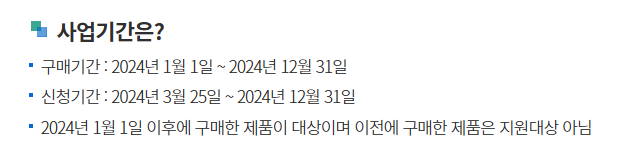 그러나 신청은 2024년 3월 25일부터 12월 31일까지로, 구매 후 즉시 신청이 가능하지 않다는 점을 유의해야 합니다.