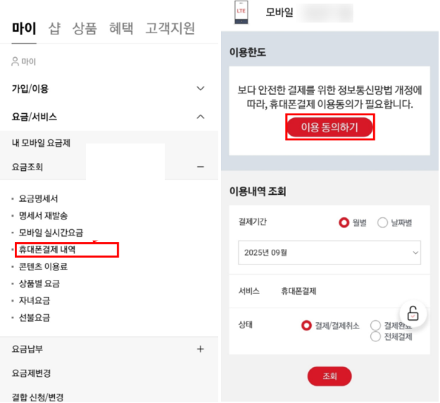 - '마이페이지' → '요금조회/납부' → '소액결제' 선택