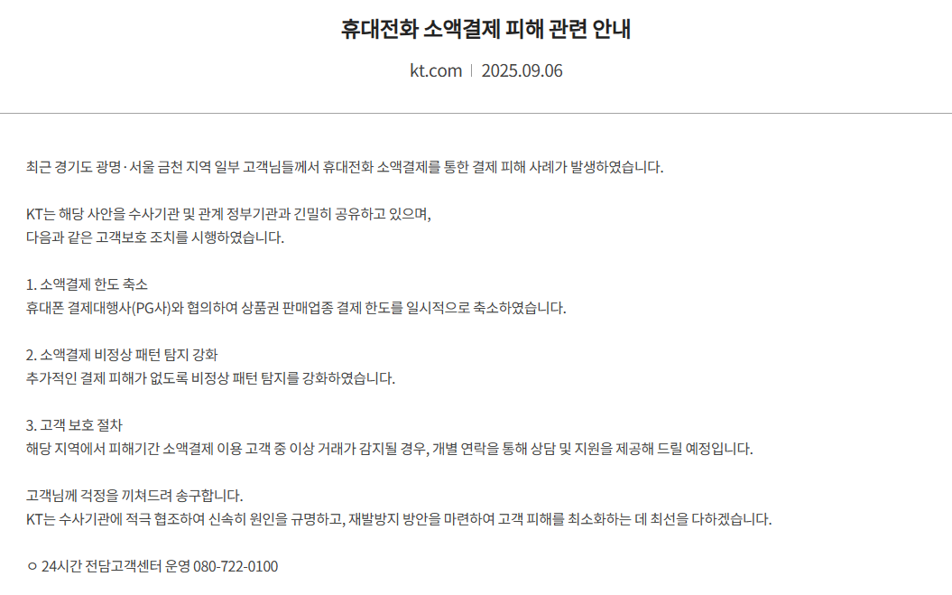 - KT 고객센터 신고: 114로 즉시 전화하여 피해 신고