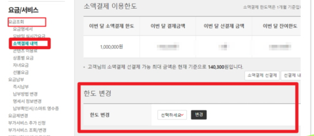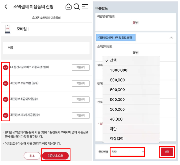 한도 변경은 KT 소액결제 차단방법과 동일한 경로로 접근하여 원하는 금액으로 설정하면 됩니다.