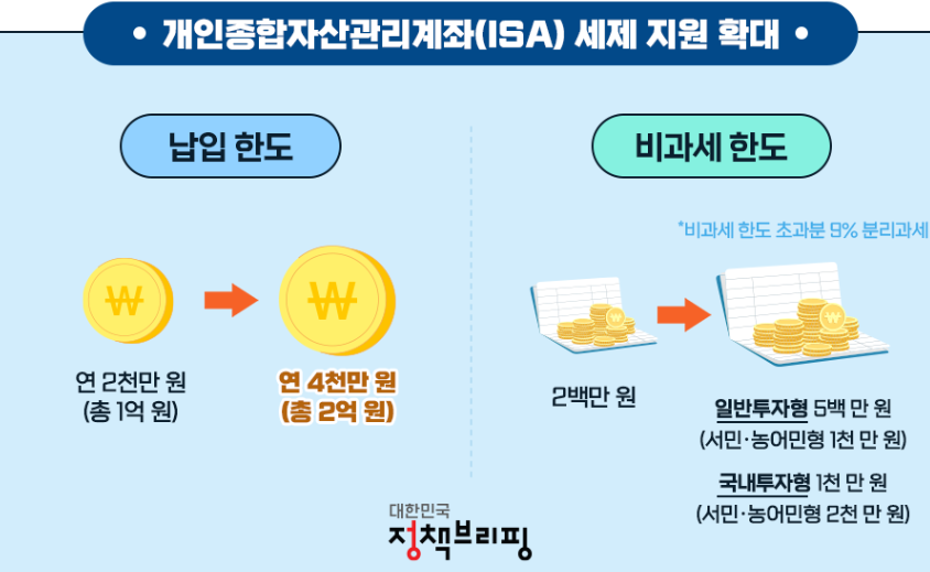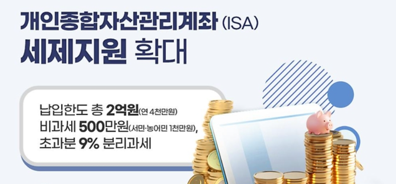 최근 isa계좌 세제지원 확대를 통해서 납입한도가 크게 늘었습니다. isa계좌는 자산 관리와 세제혜택을 동시에 제공하는 대표적인 재테크수단으로 정부의 정책 지원 아래에서 개인의 금융목표를 달성할 수 있도록 돕고있으니 꼭 관심갖어보시길 바랍니다.