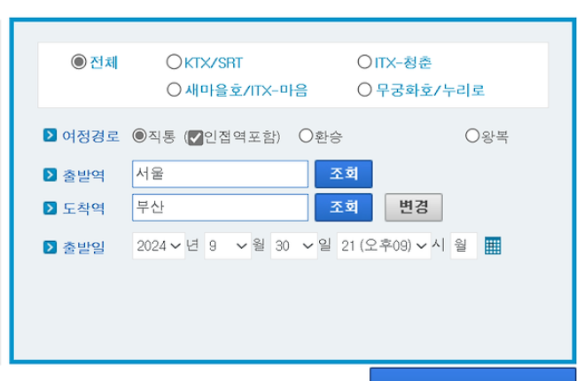 출발역과 도착역, 출발 날짜를 선택합니다. 이후 원하는 열차와 시간대를 선택하고, ‘조회하기’ 버튼을 클릭합니다.