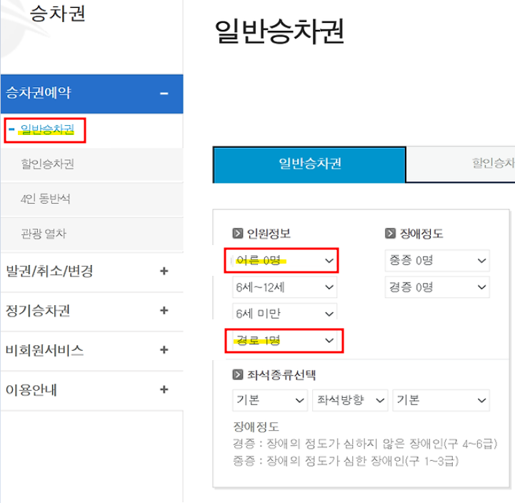 사이트 상단의 ‘일반 승차권’ 메뉴를 클릭합니다. 이후 인원 정보를 설정하는 과정에서 ‘어른’을 ‘65세 이상’으로 변경합니다. 여기서 경로우대 1명으로 선택해야 할인 혜택을 받을 수 있습니다.